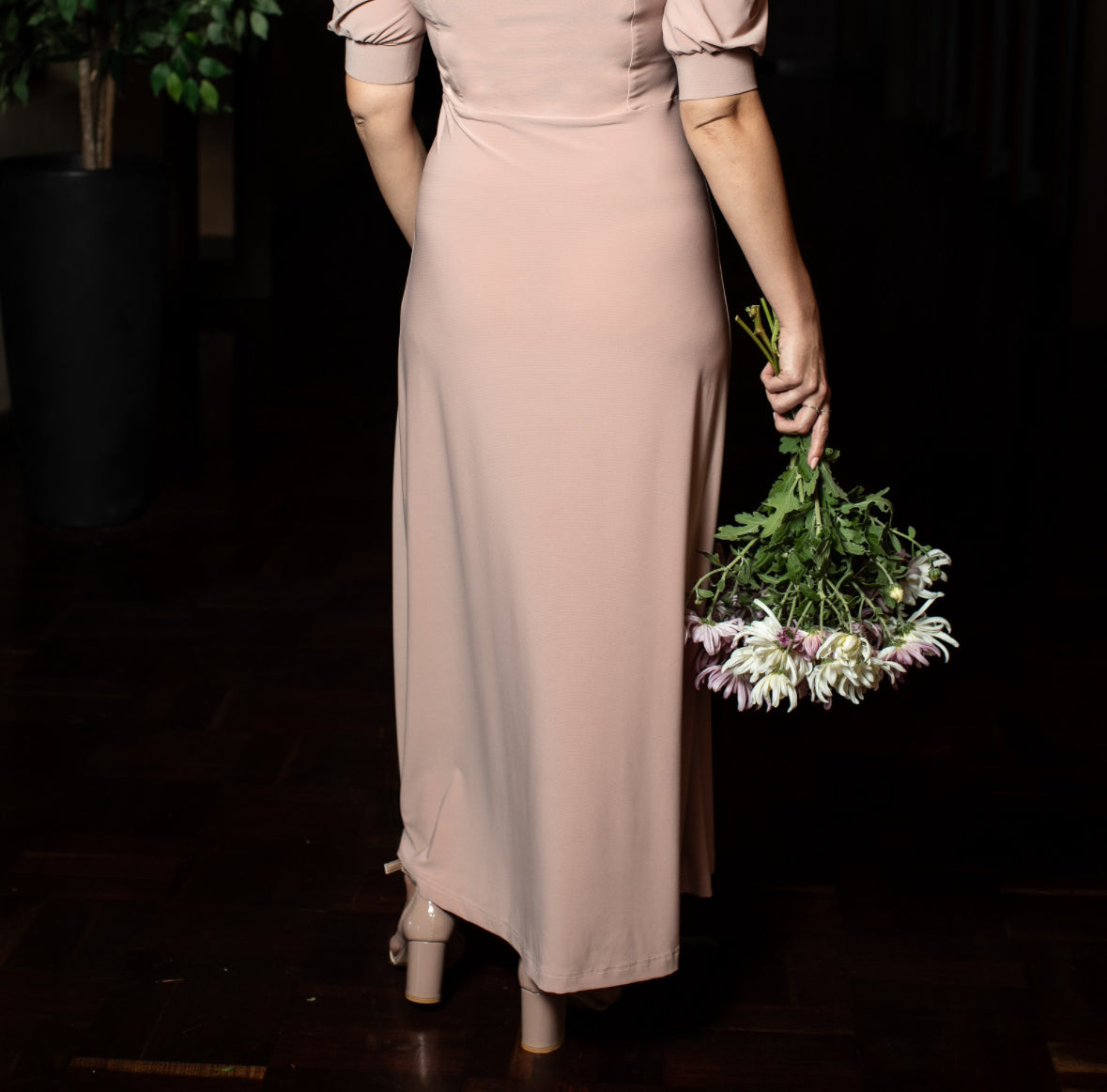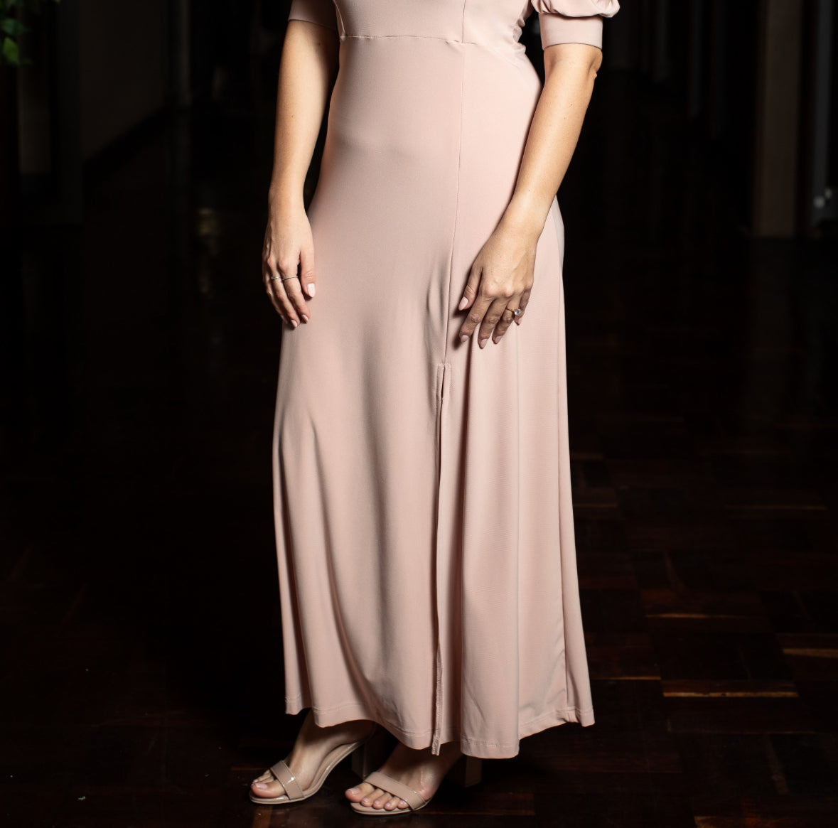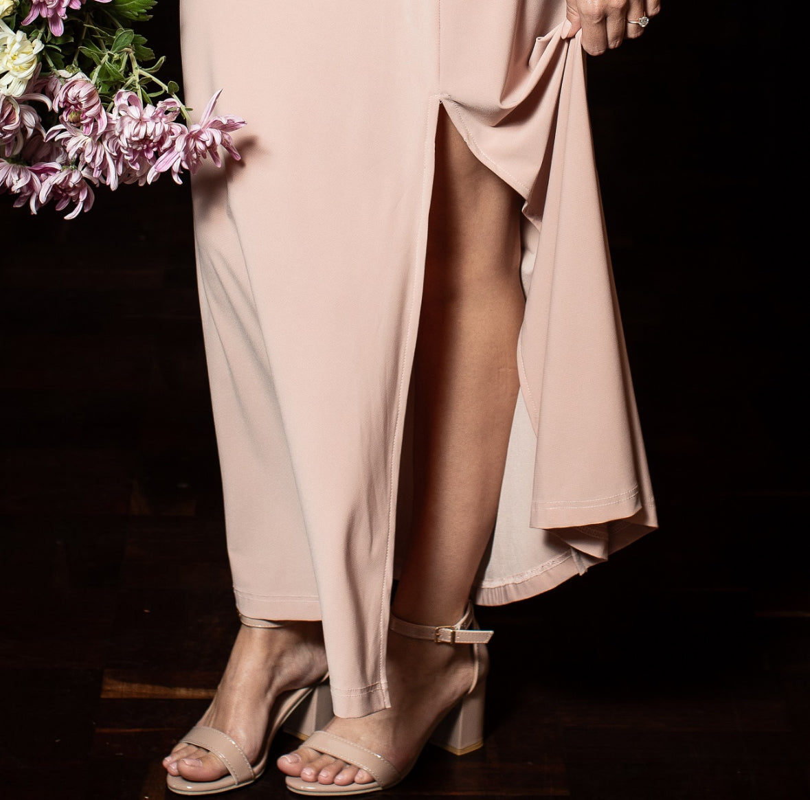 Features a A-line silhoutte with a front slit. The length is 100cm.