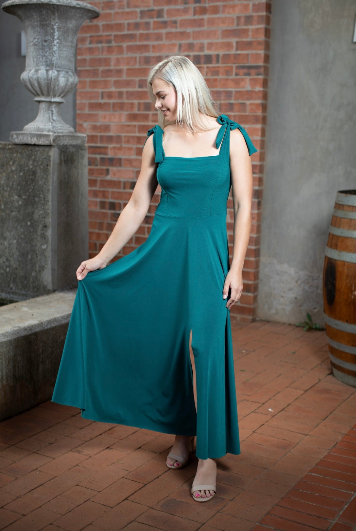 Introducing the Begonia dress. This dress features a square neckline that has tie straps at the shoulders. This dress features a mid-length flare skirt.