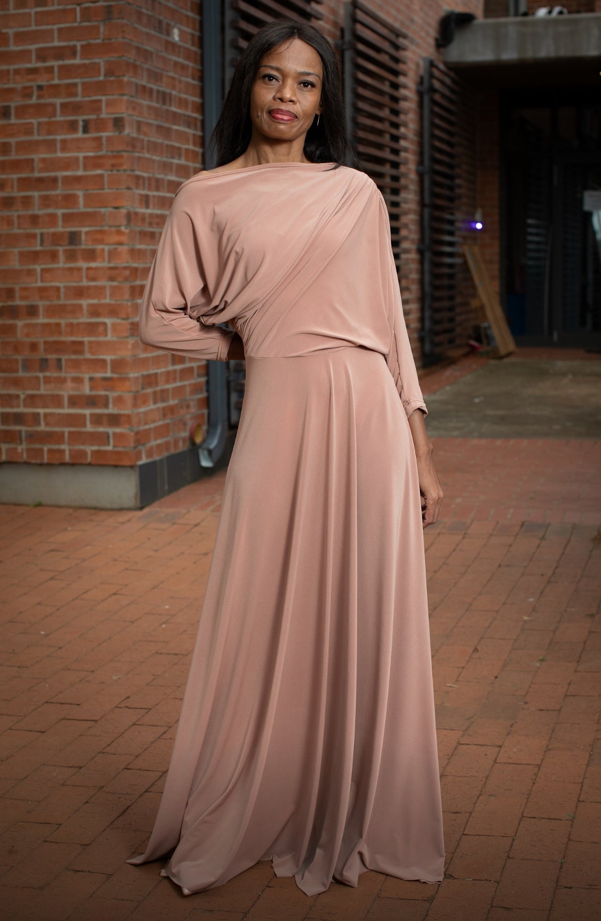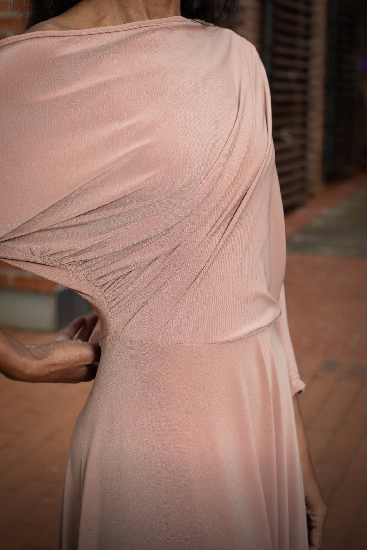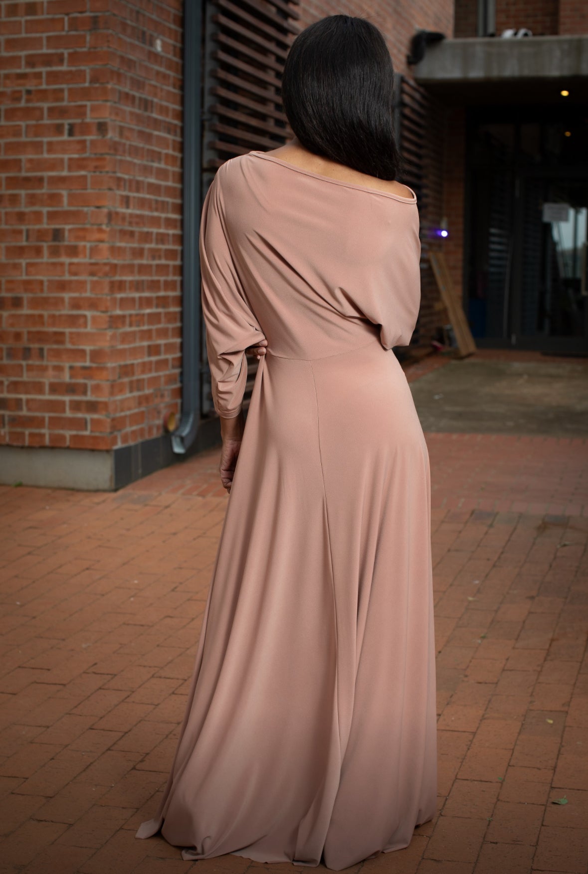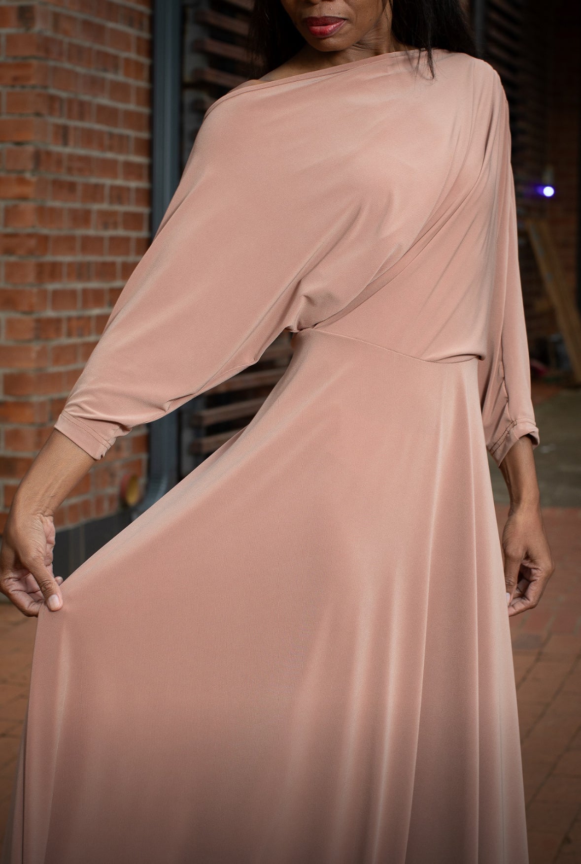 This off shoulder dress is a statement piece that deserves to be shown of. Featuring ruffed shoulder details with batting sleeves.