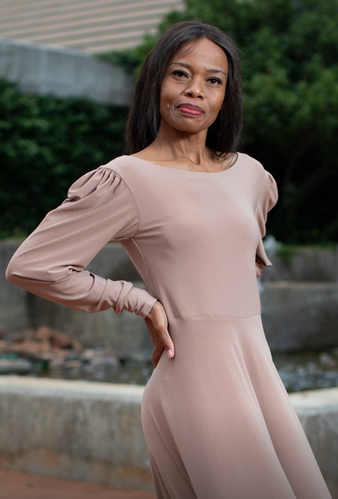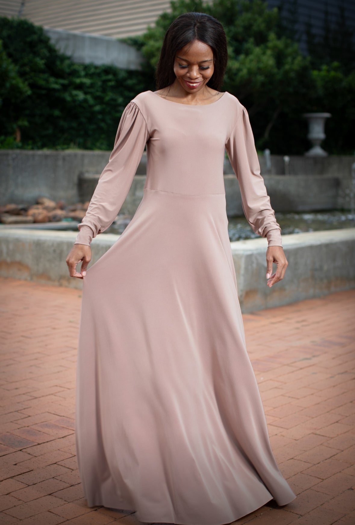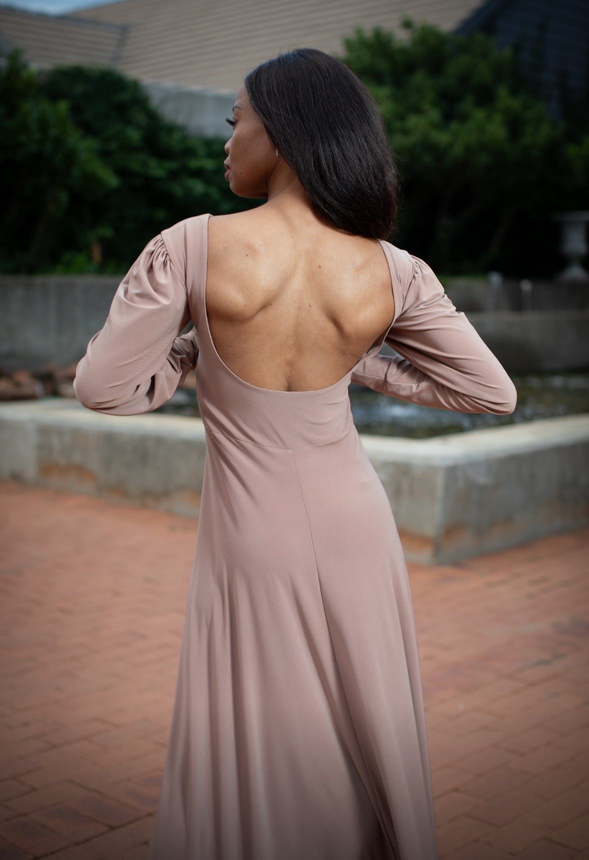 Simple, yet sophisticated, this dress features a round neckline with ruffled shoulder cuffed sleeves and a low back.