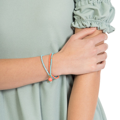 3-strand Stretch Gem Bracelet with Coral drop, Amanzonite bezel & a Gold plated Disc