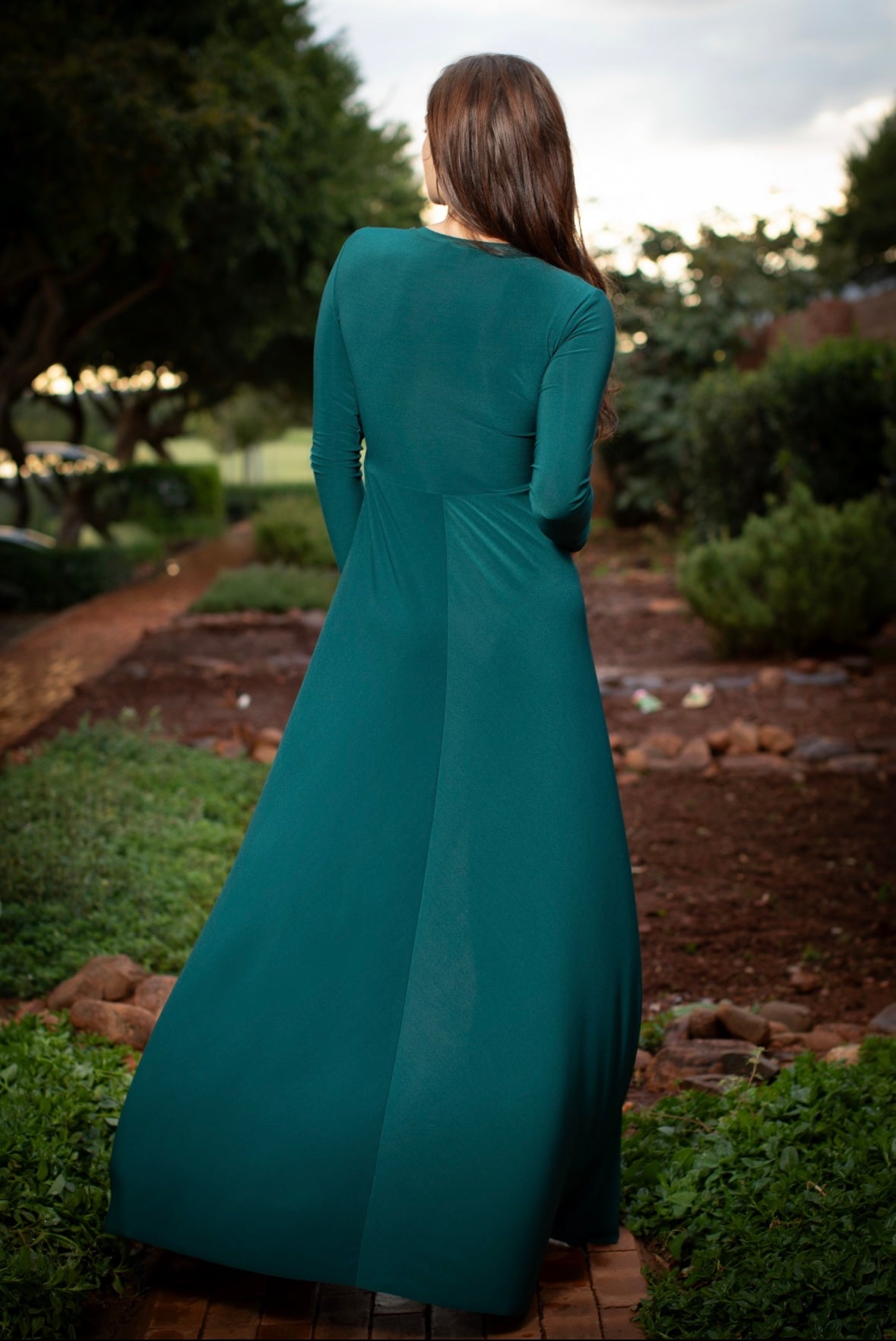 Sleek and sophisticated, this long sleeve bridesmaid dress pairs a V-neckline and a crossing waist panel with a slit in front of the skirt.