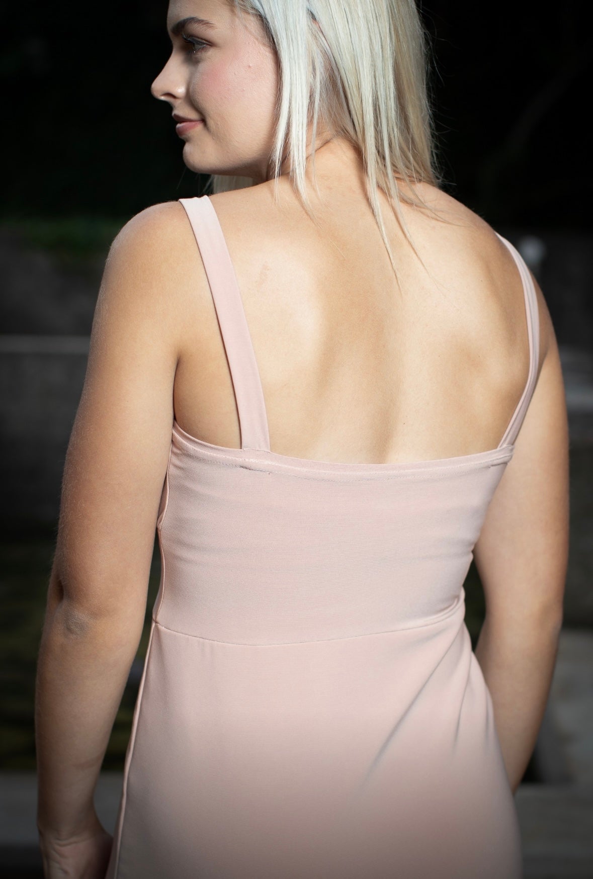 This dress features a low v-neckline with a waistband and fitted skirt.
