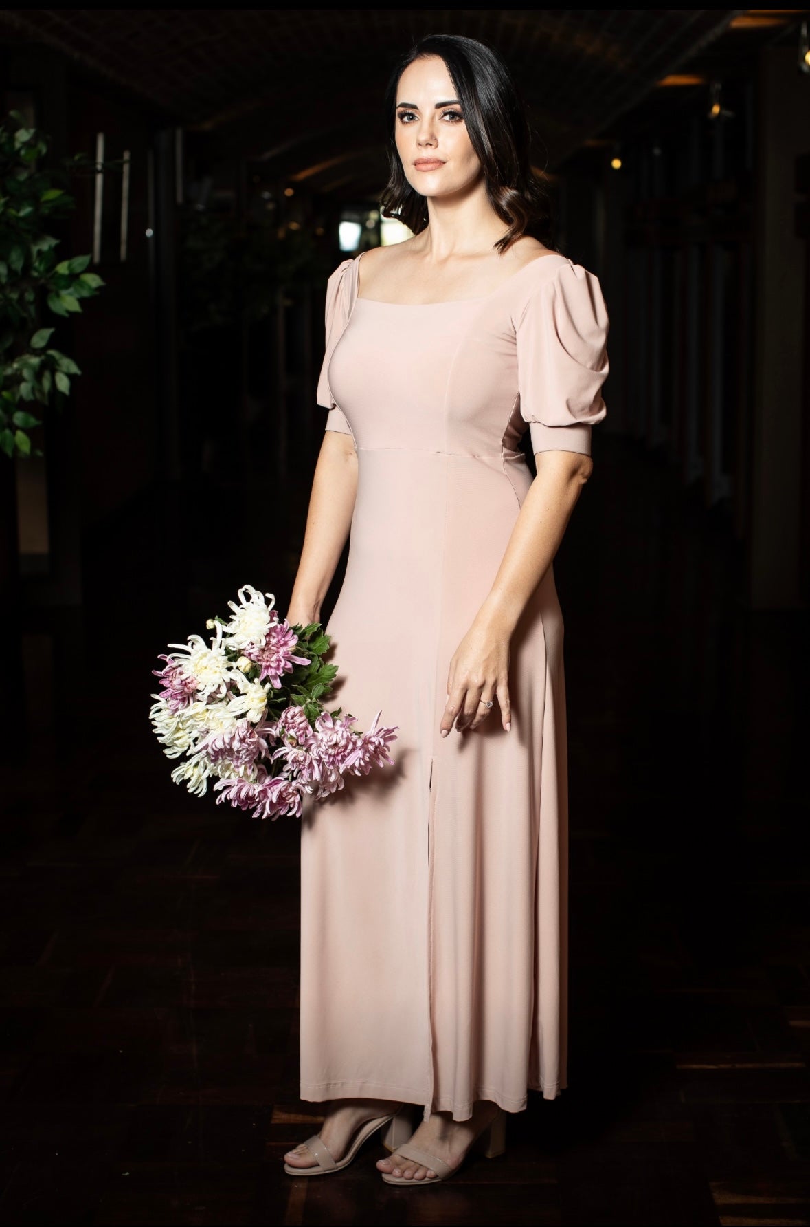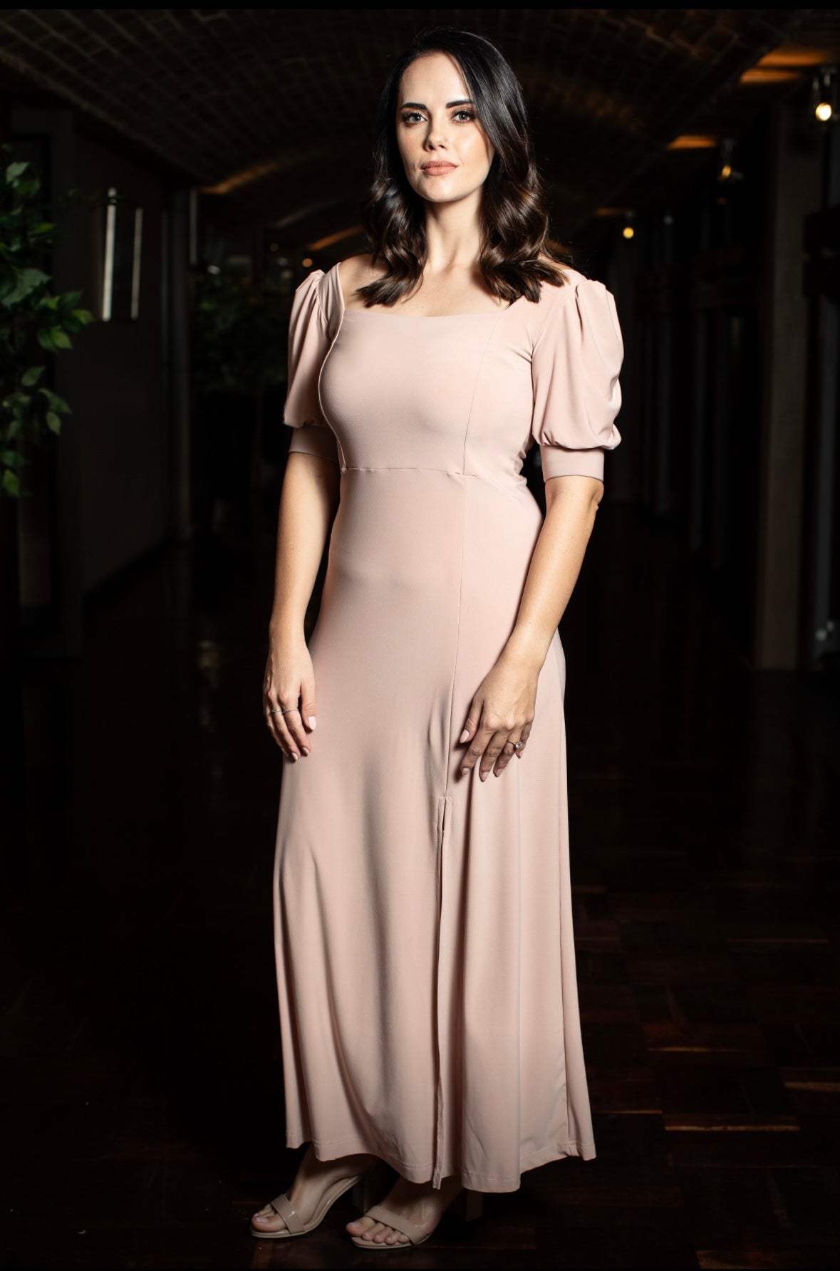 This dress features a square neckline with seam details, soft puff sleeves. The skirt is A-line with a front slit.