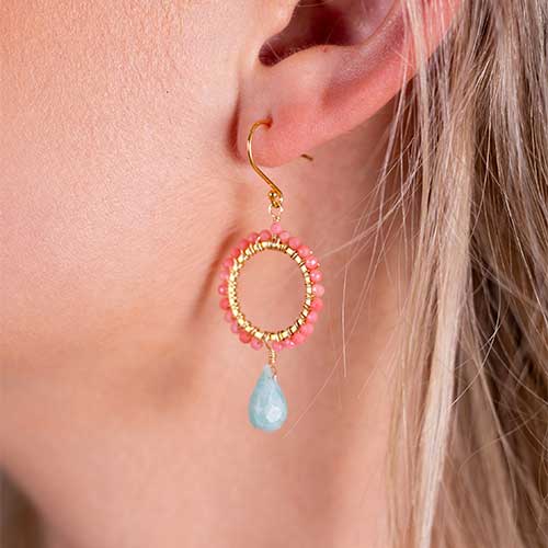 Small Hoop earrings wrapped with Coral & Amanzonite drops