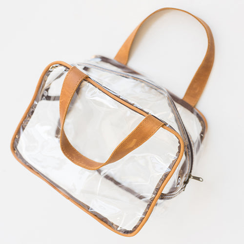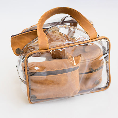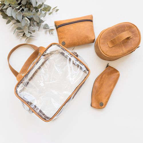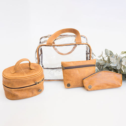 The Leather Cosmetic Set features a plastic transparent bag that includes: