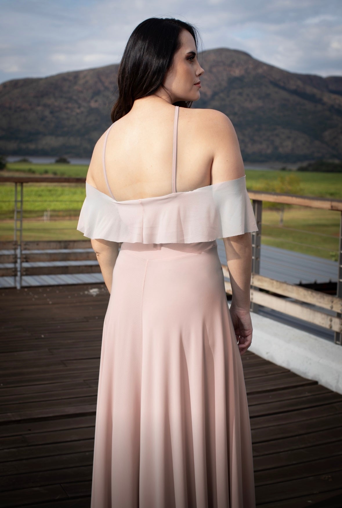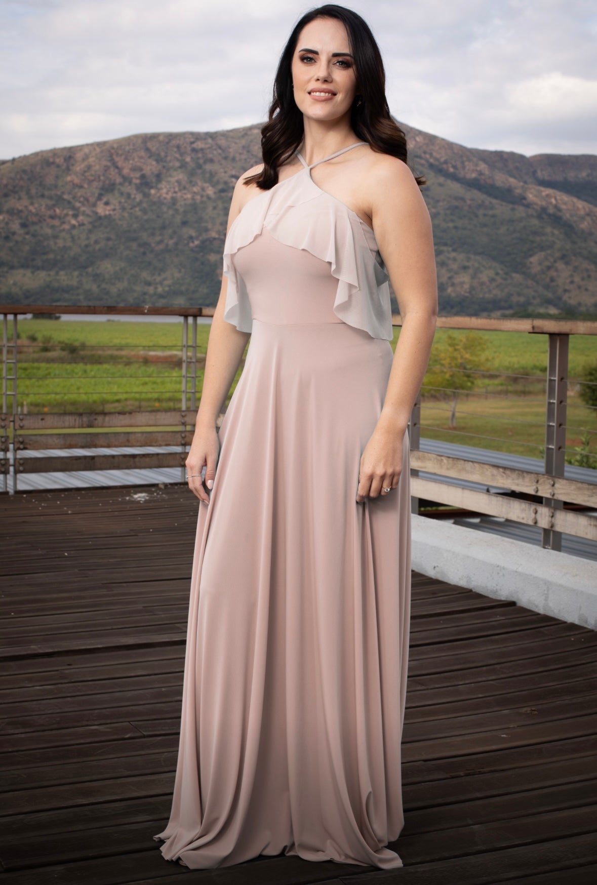 The Cosmos dress features a halter-neckline with open shoulders and frill detail along the neckline and shoulders.