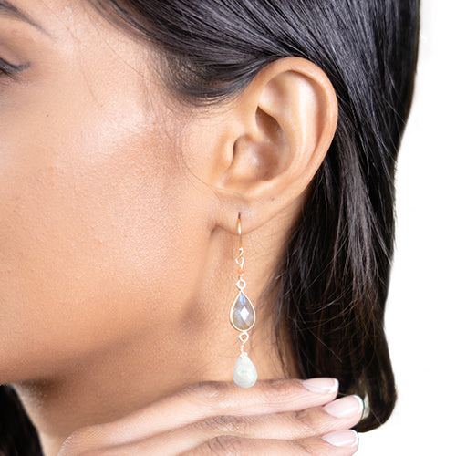 Small labradorite bezel earrings with Coral, and Amanzonite drops