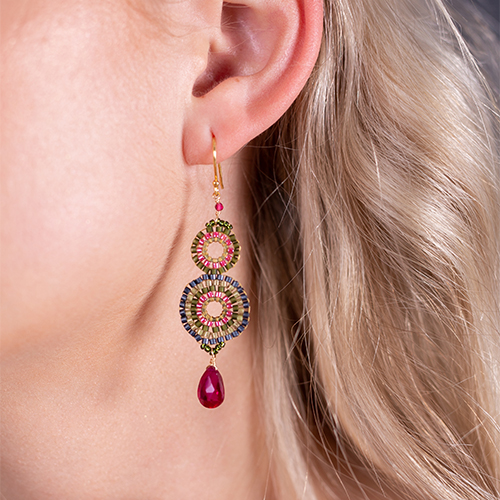 Double glass seed bead miyuki connector earrings with pink Tourmaline Briolette drops