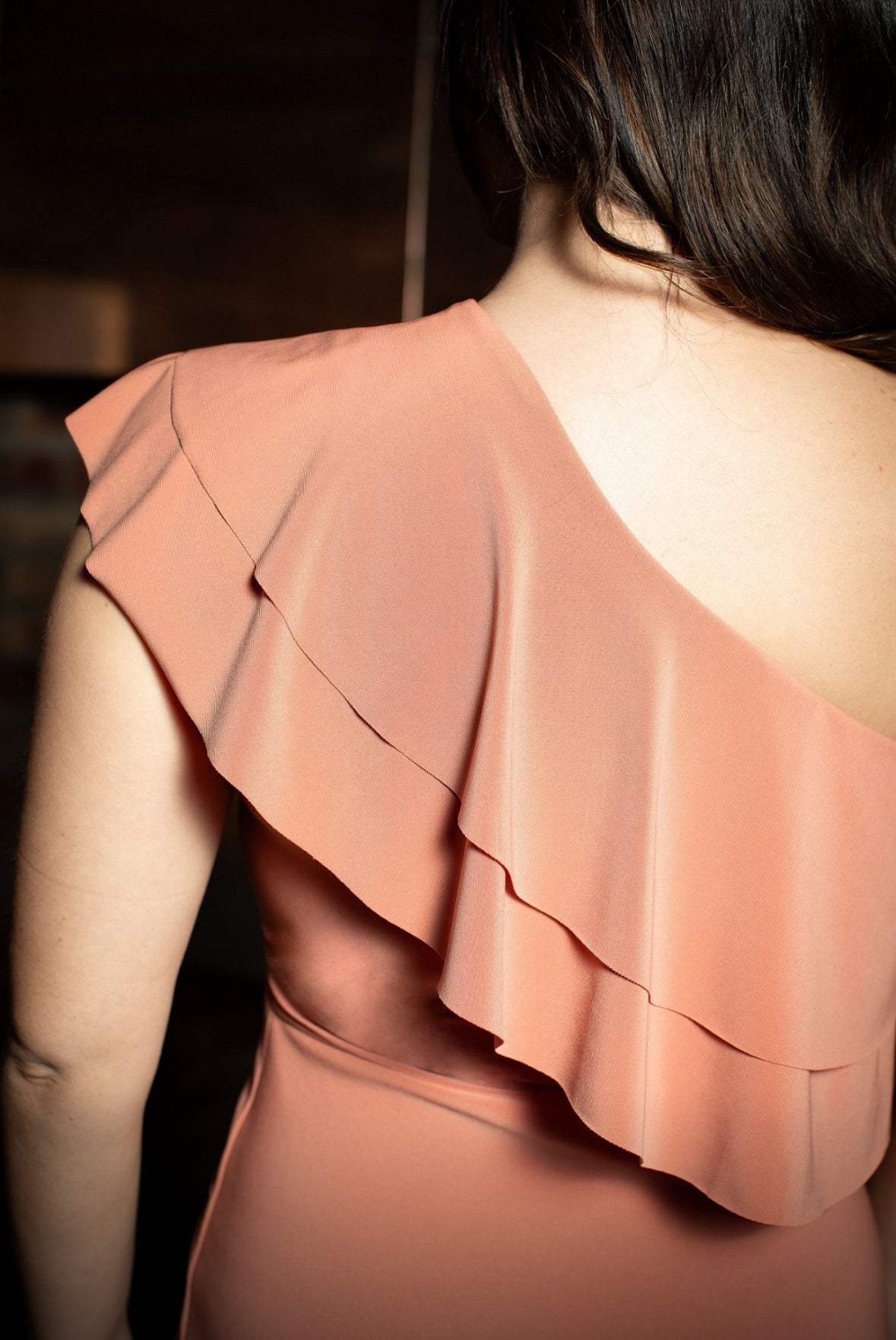 Feature a one shoulder neckline with a double ruffled hem. Top length 36cm
