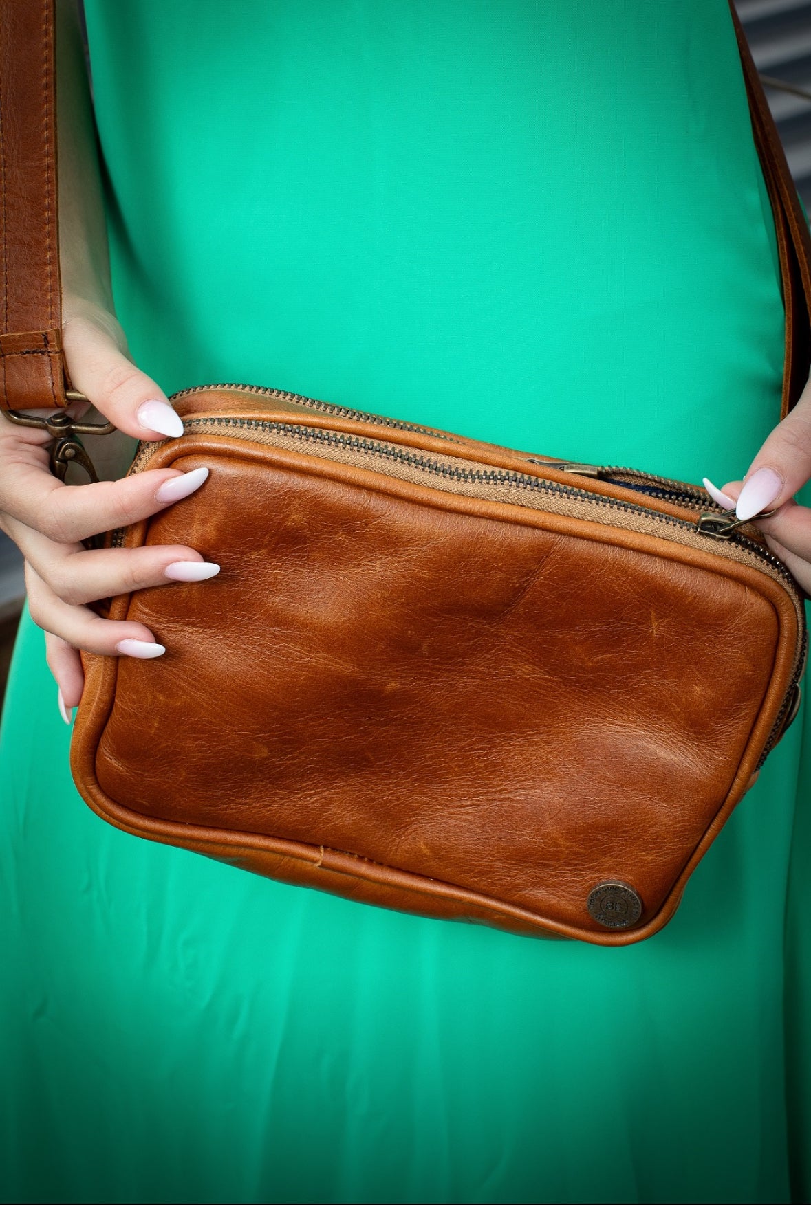 The Zulika double zip bag features two compartments with adjustable straps that can hook off.