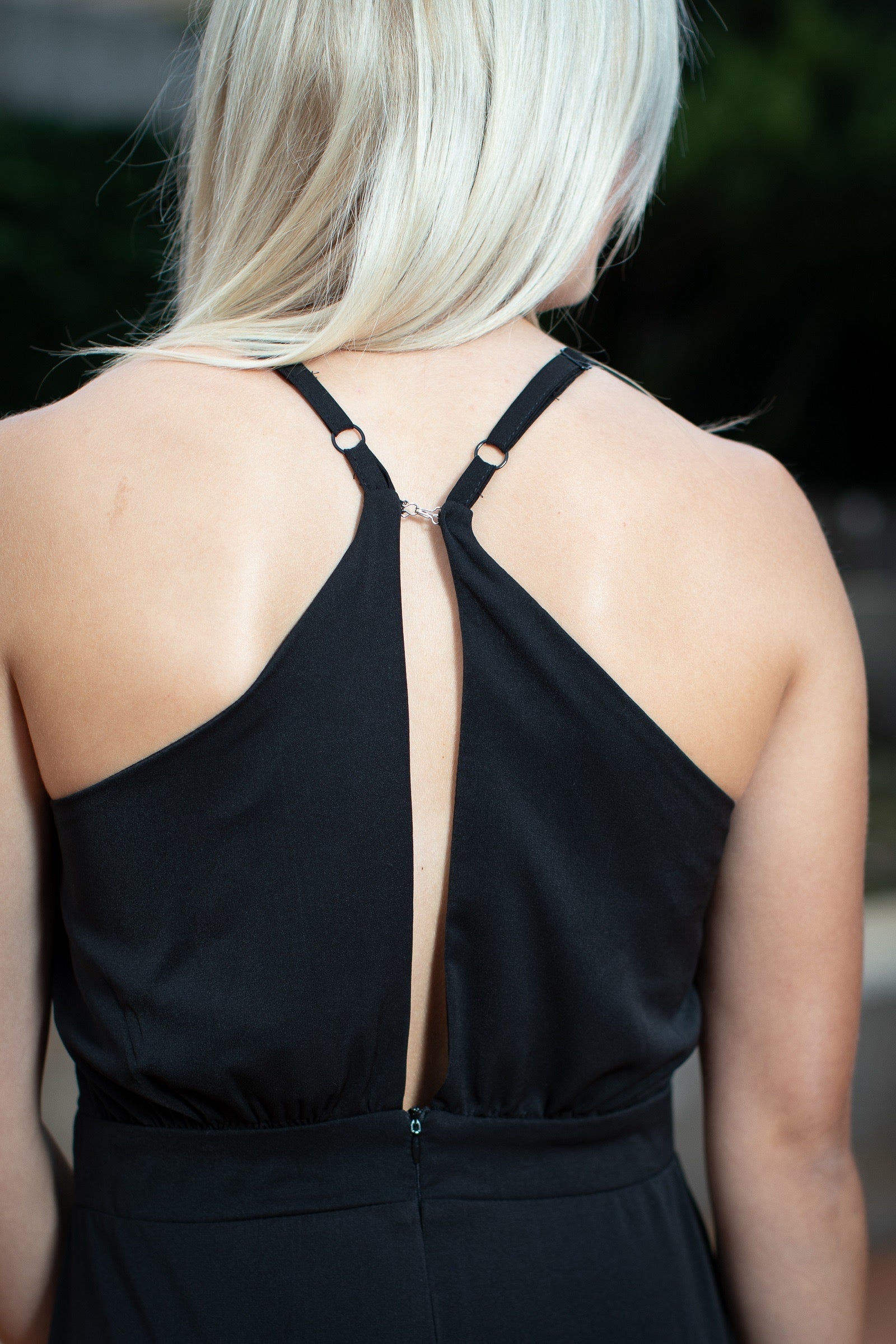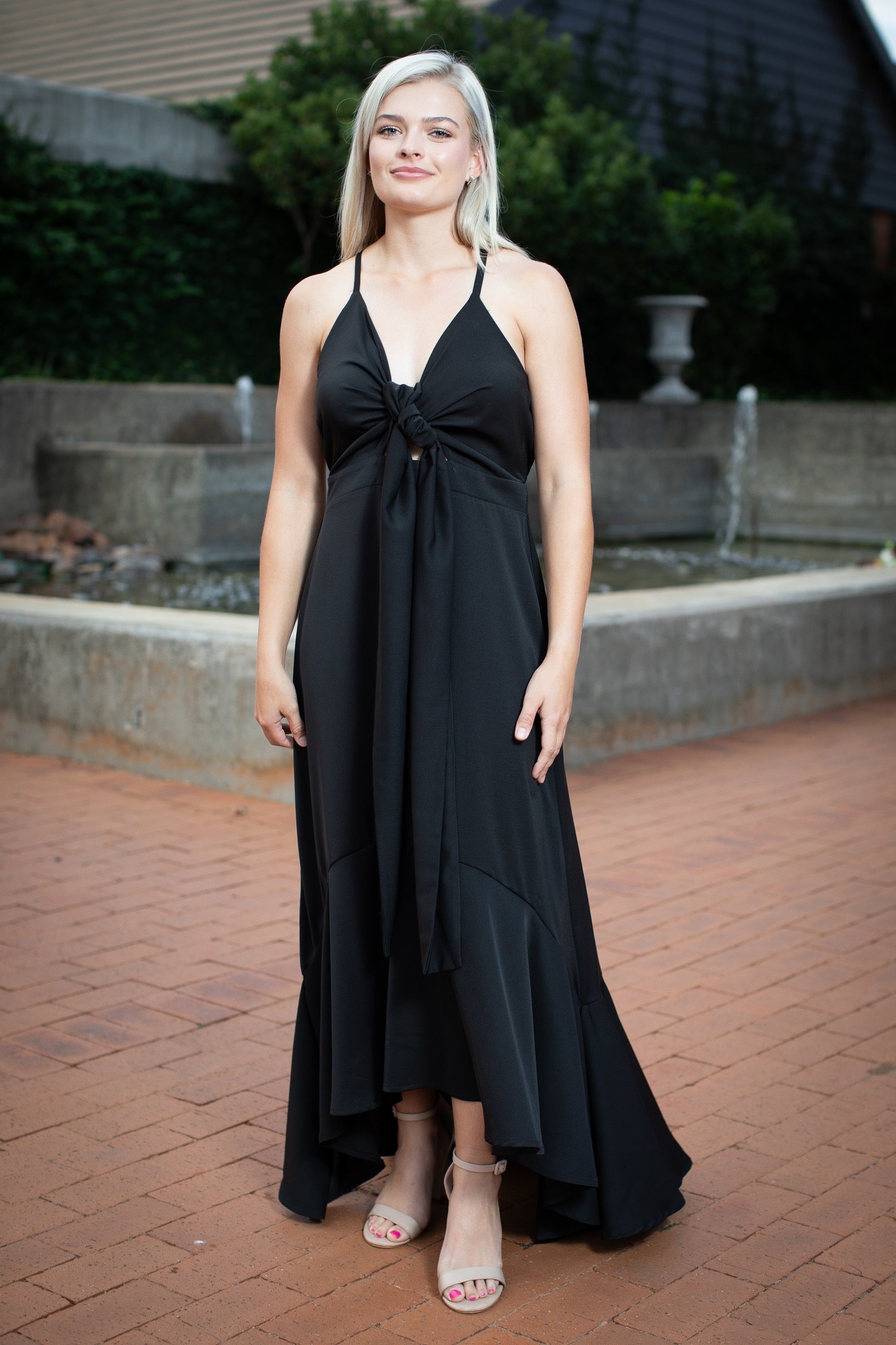 This dress features a halter neckline with an A-line shape and long length. The daring low back of this dress makes it flirty.