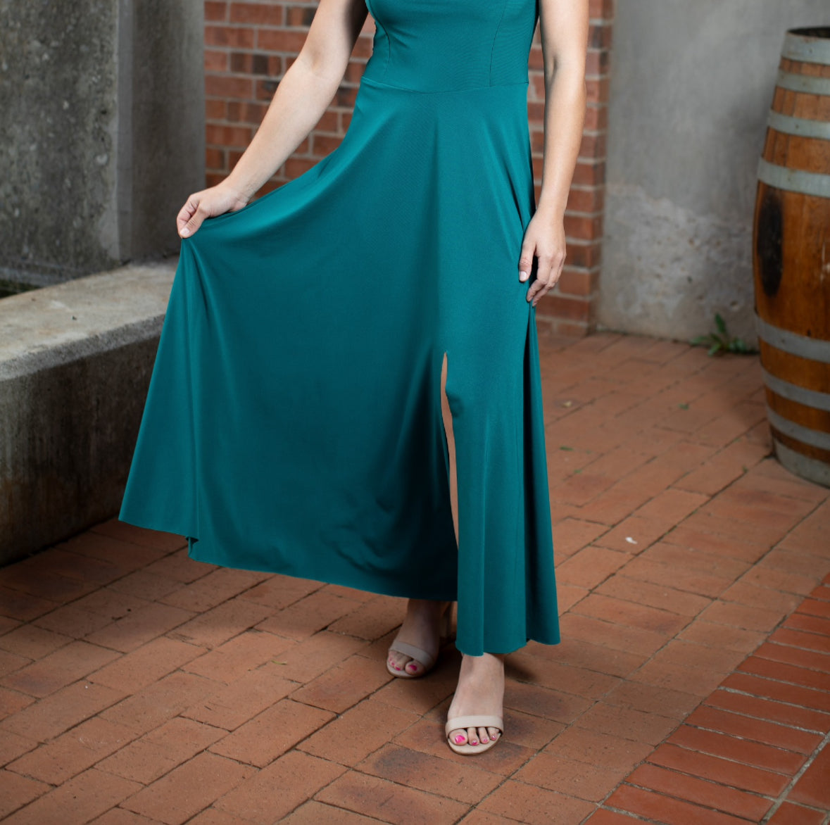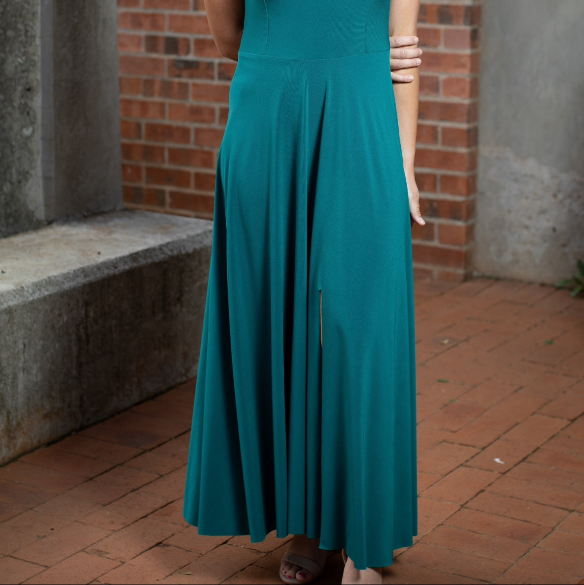 Features a flared mid-length skirt with a front slit. Length 90cm.