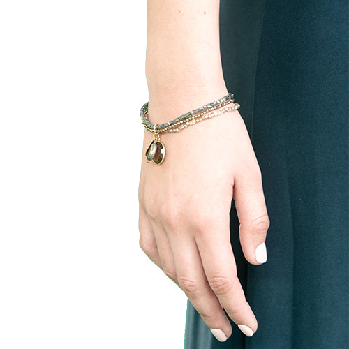 3-strand Stretch Gem Bracelet with Moss Agate, Smokey Quartz & a Gold plated Disc