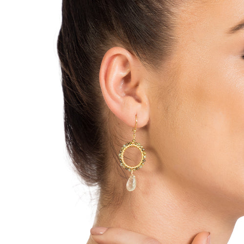Small Hoop earrings wrapped with Pyrite and Hermatite with a Green Amthyst Drop