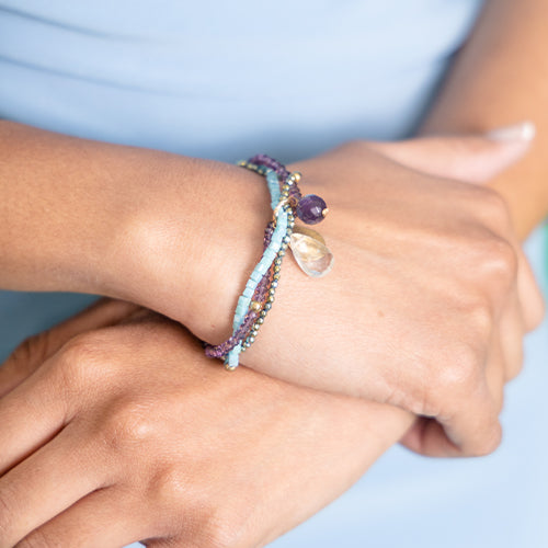 3 Strand stretch bracelet with a purple & light green amathyst drops & a gold plated disk