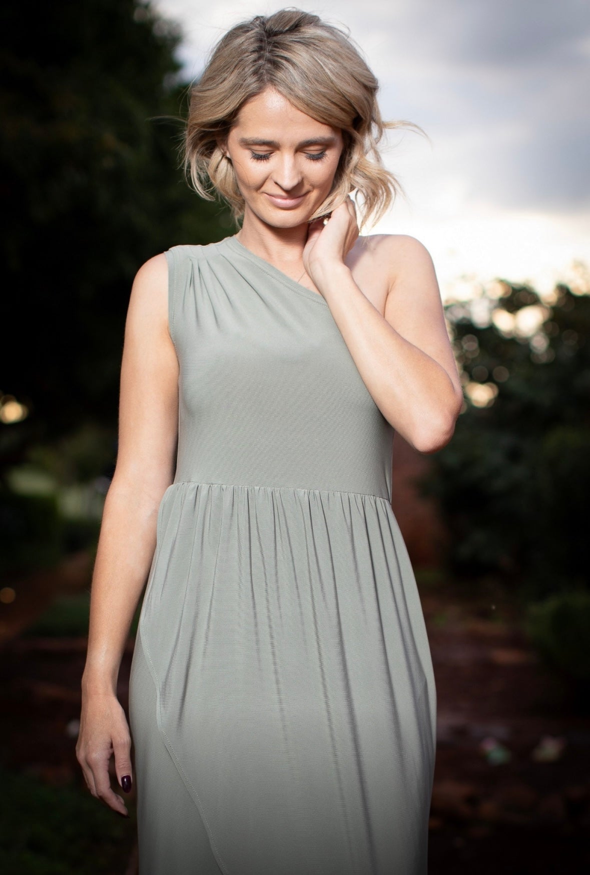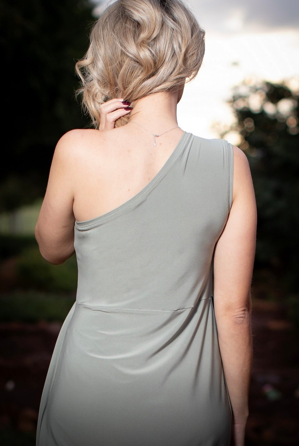 A one-shoulder wonder, the Harmony dress features a one shoulder with a pleat detail.