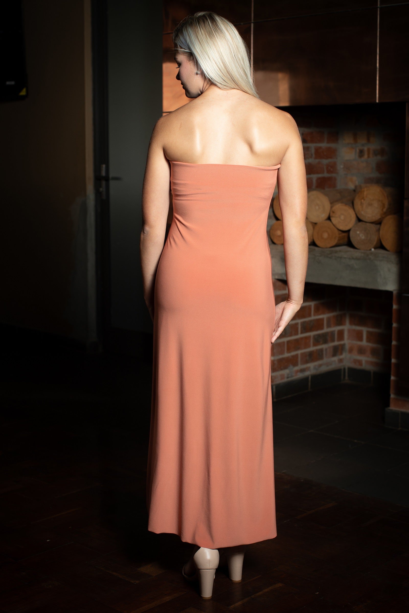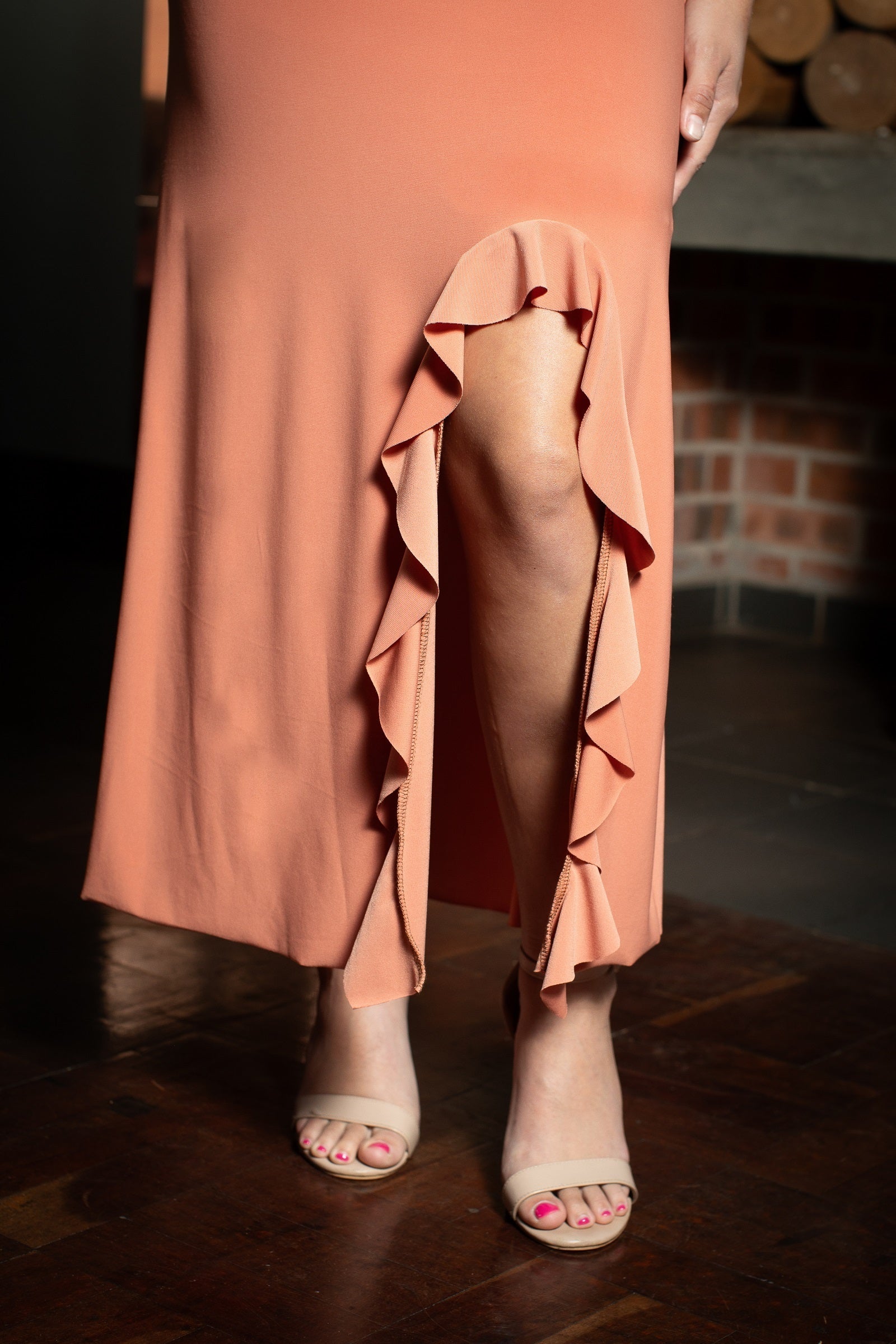 Flirty and Fun! This Holly dress features a bo`ob-tube neckline and fitted shape with a slit in front that has a ruffled hem.