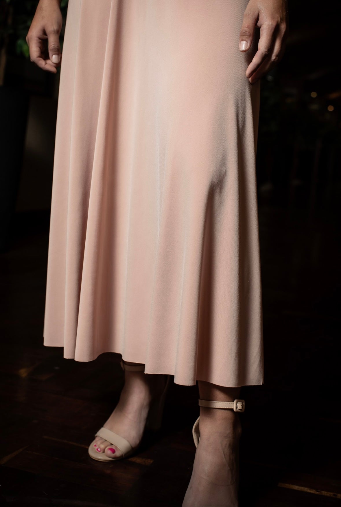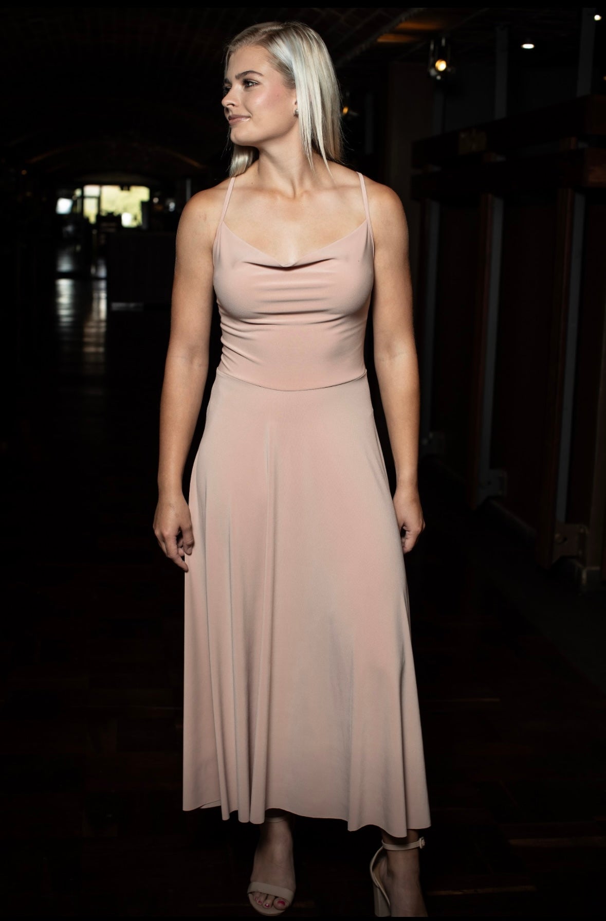 This dress features a sleek and classic cowls neck with crossover straps at the back. The skirt of this dress is full flare mid-length.