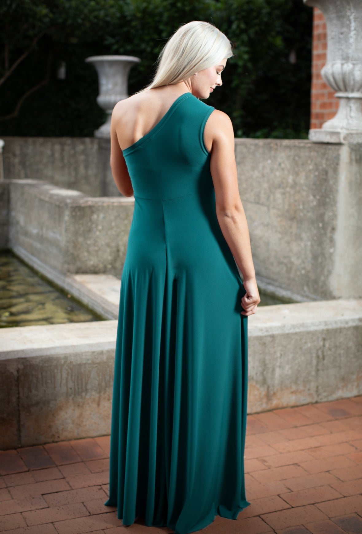 The Jasmine pleated one shoulder bridesmaid dress is timeless and chic. This floor sweeping dress has a romantic feel with its long full flair skirt.