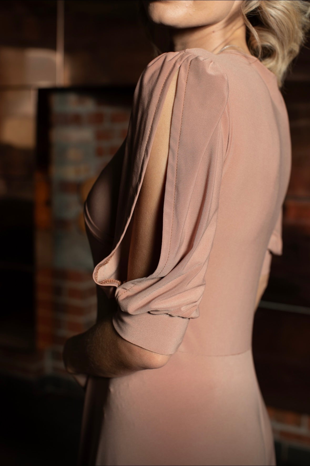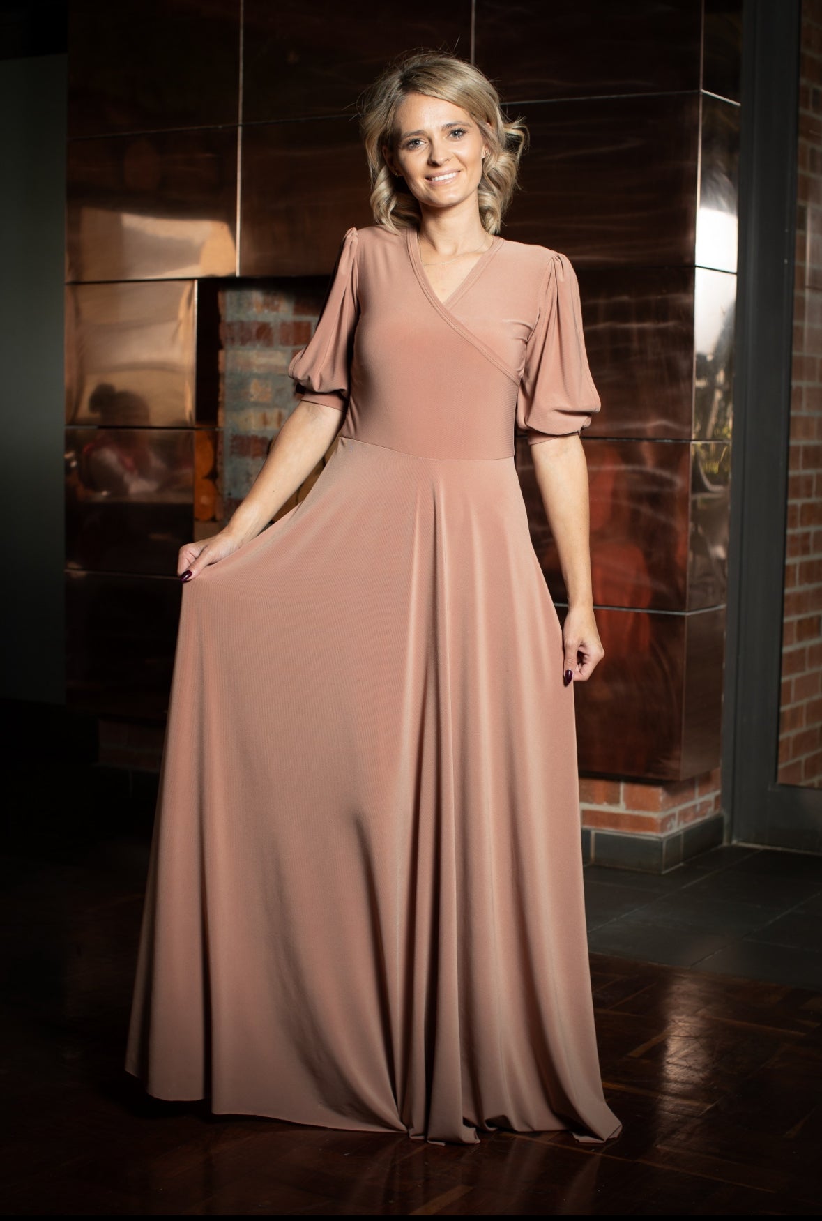 Sleek and sophisticated, this long sleeve bridesmaid dress pairs a V-neckline and a crossing waist panel with a slit in front of the skirt.