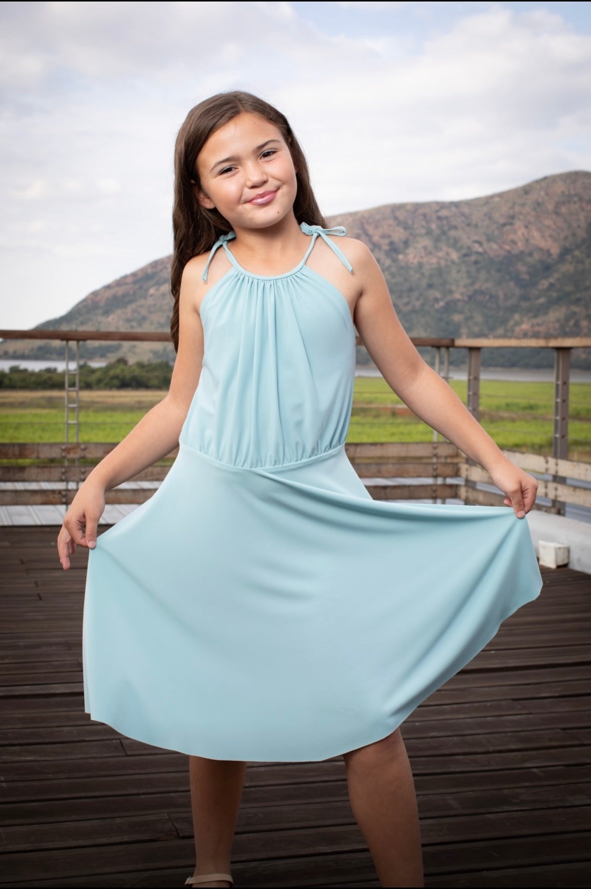 Soft and airy describes this dress perfectly. With a halter neckline, mesh detail and soft, flowy skirt.
