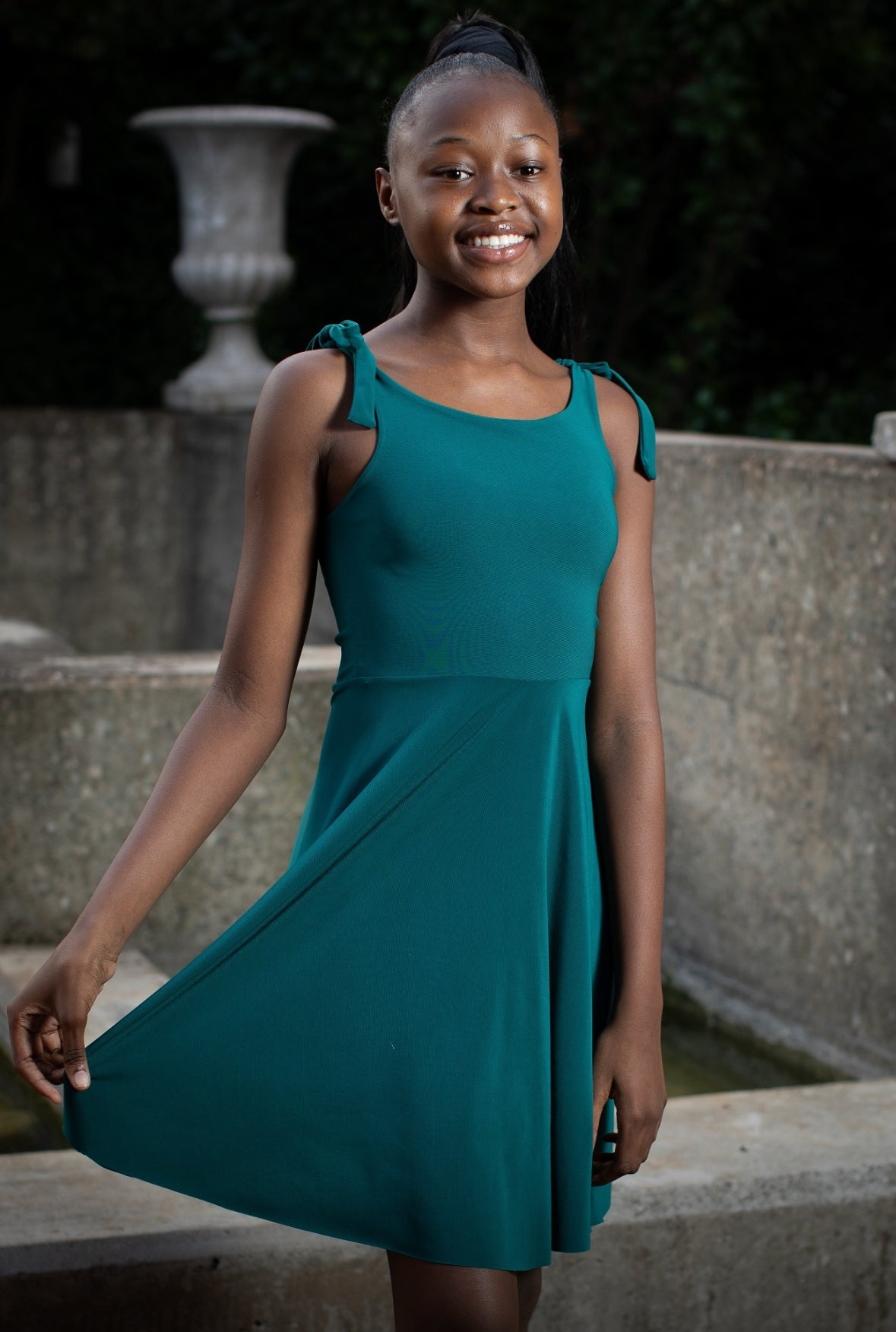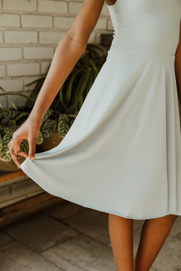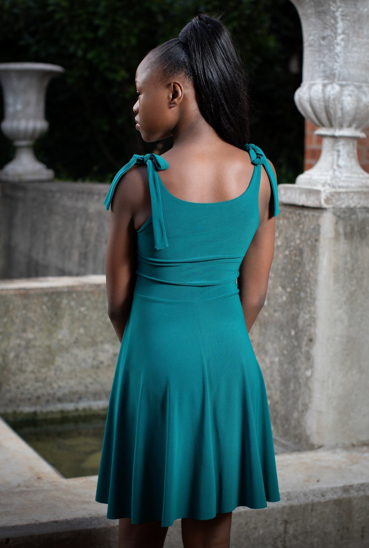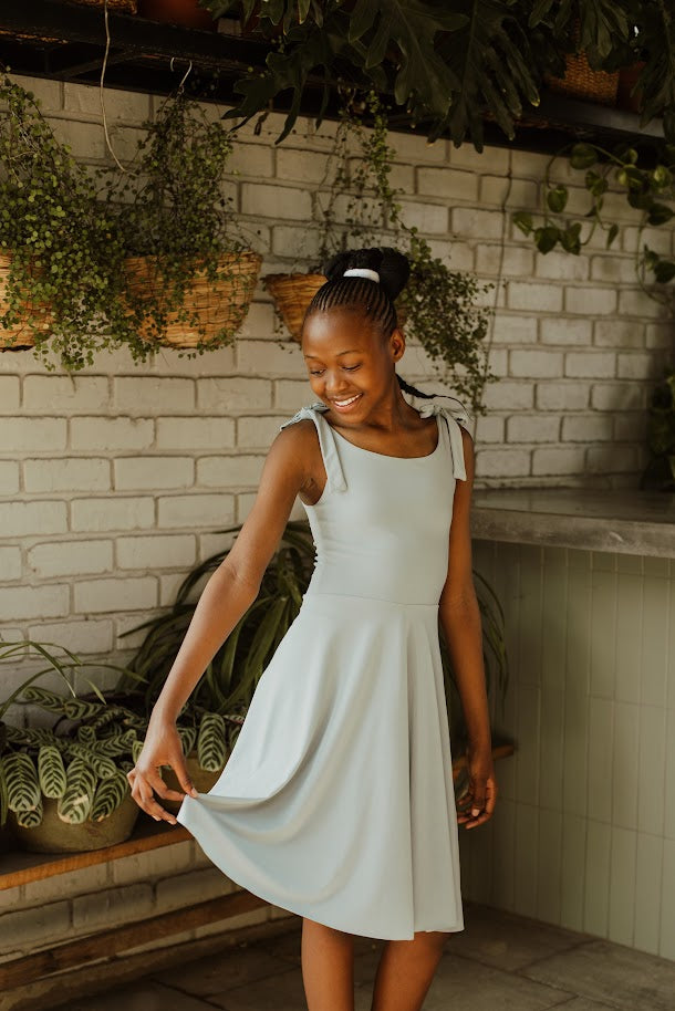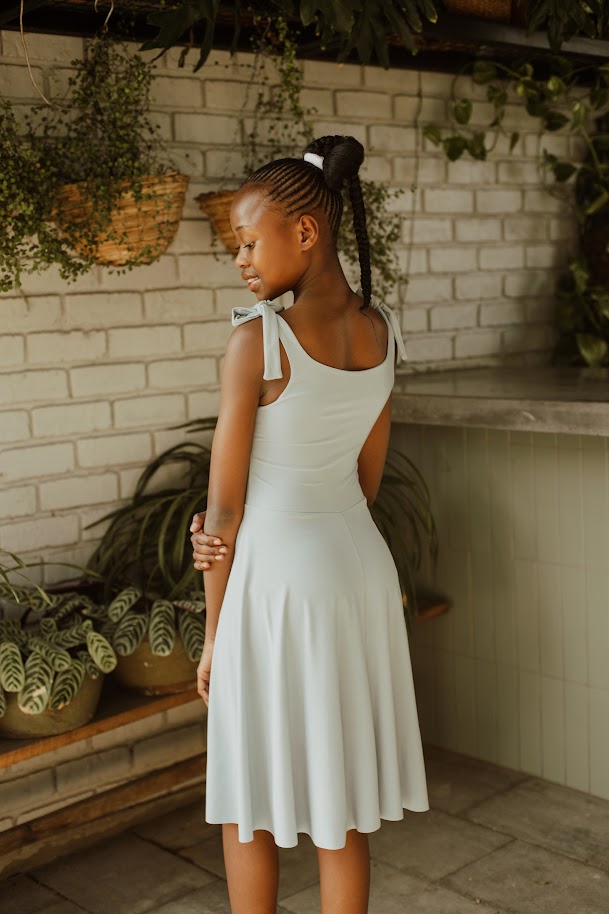 This fun and playful dress offers a fresh take on tradition. Featuring a round neckline with tie-up straps and a flare skirt.