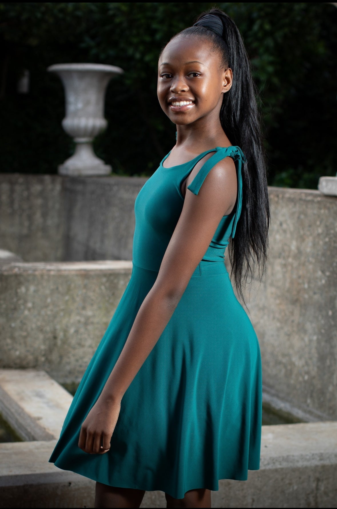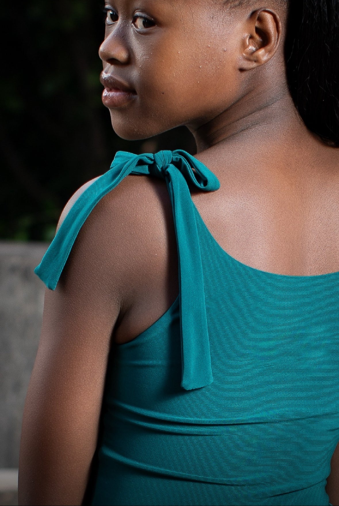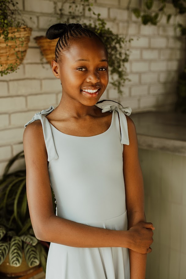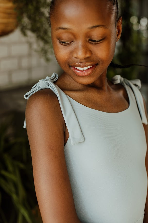 This fun and playful dress offers a fresh take on tradition. Featuring a round neckline with tie-up straps and a flare skirt.