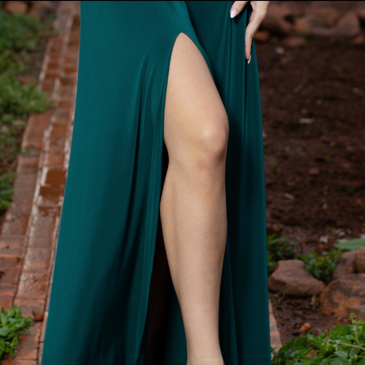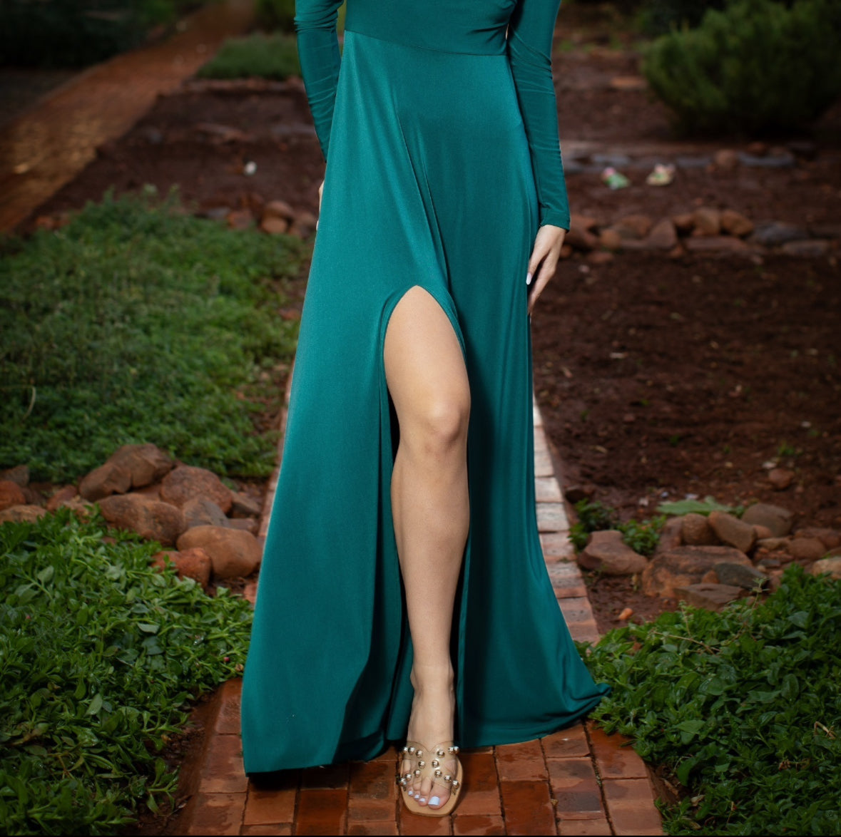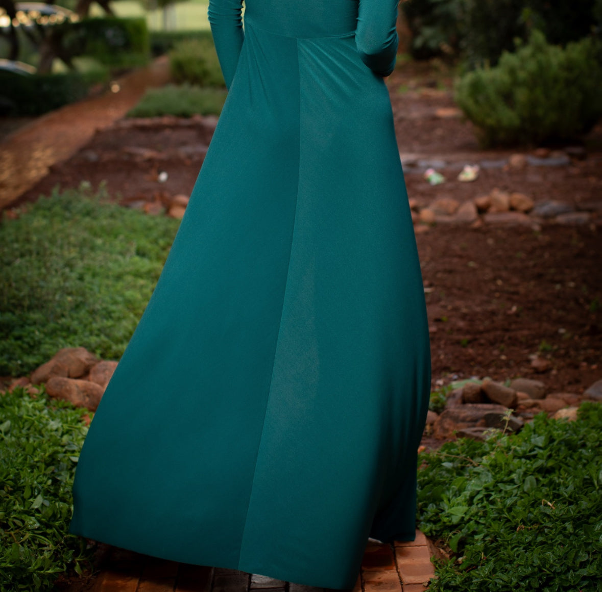 Features a full length flare skirt with a front slit. The length is 116cm.