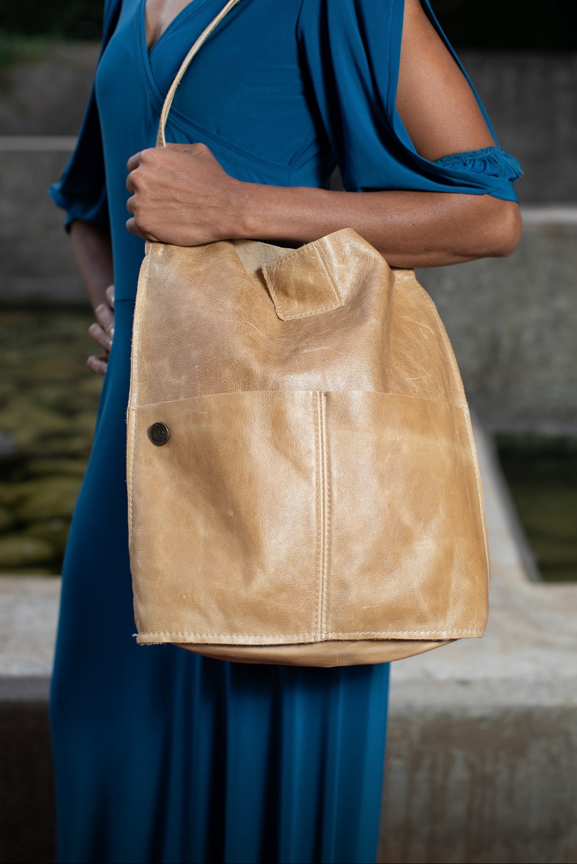The ninna handbag features a magnetic closure and has double pockets in the front for quick asses.
