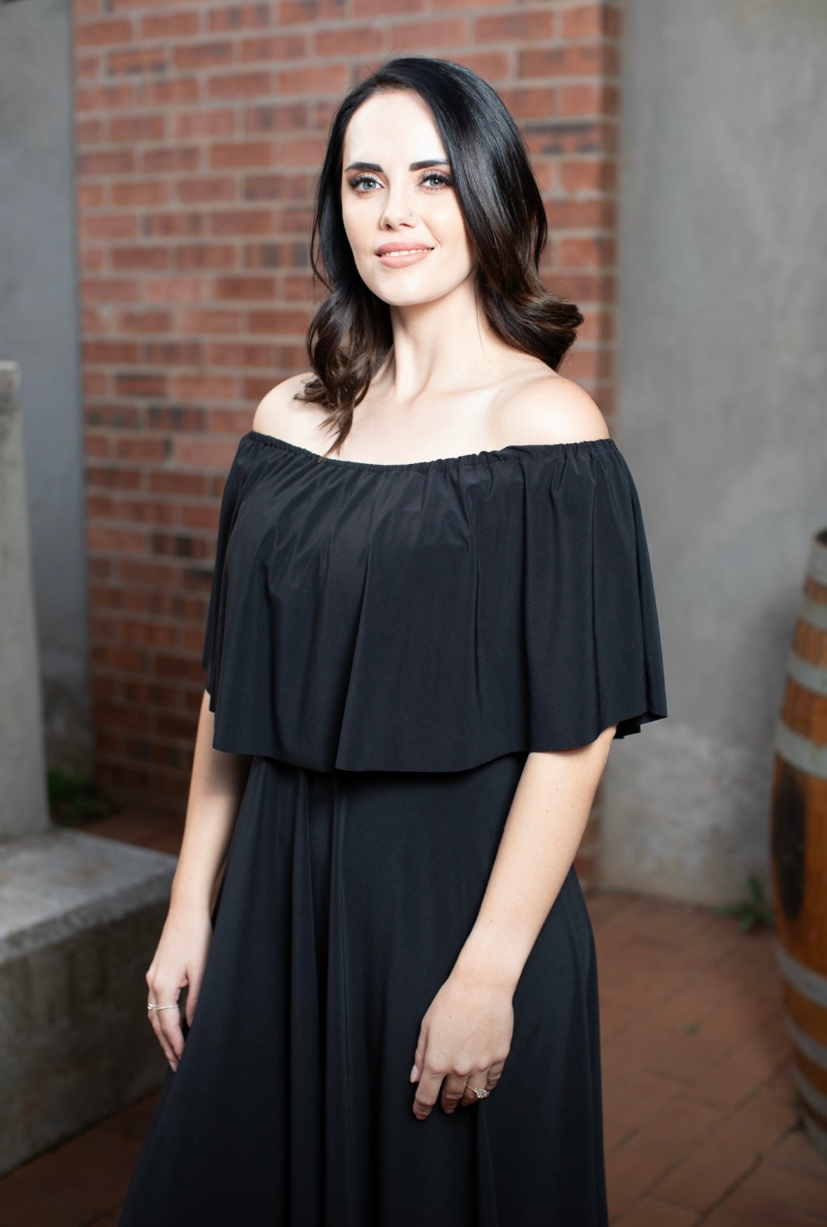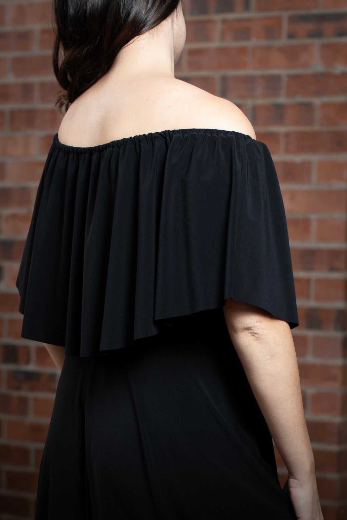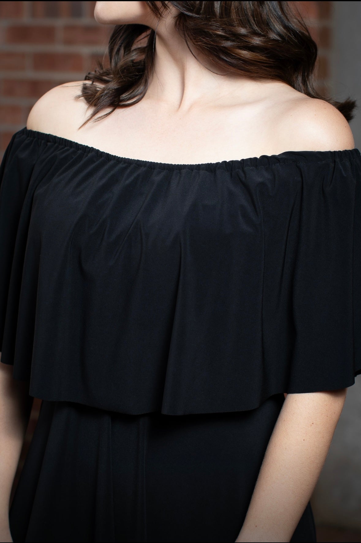 Features an of the shoulder neckline with a soft fall frill at the neckline gong to the waist. Top length 36cm.