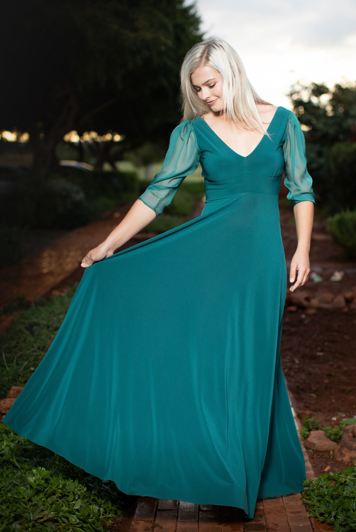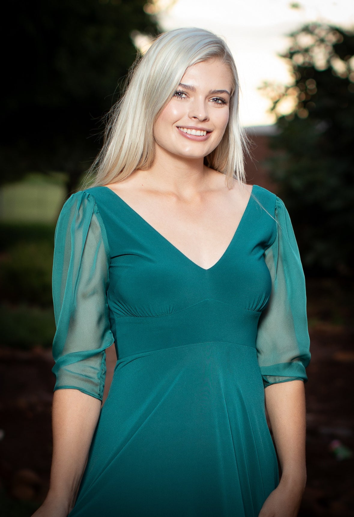 This dress features a v-neckline with a waistband and elegant chiffon sleeves and a low rounded back