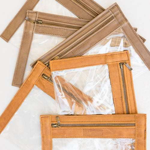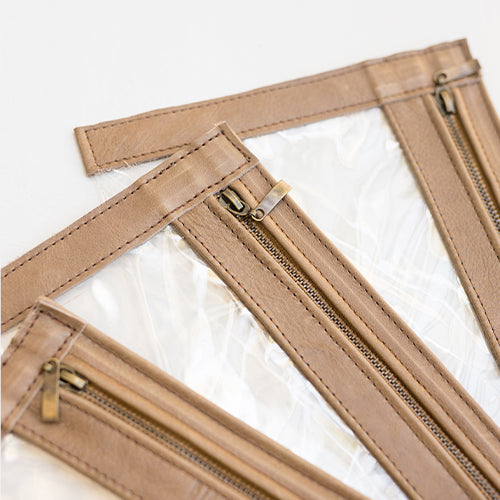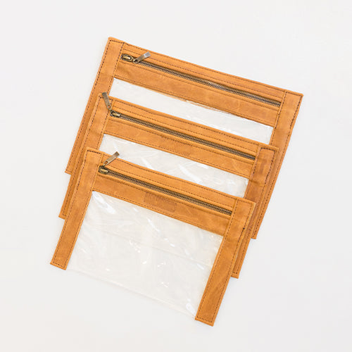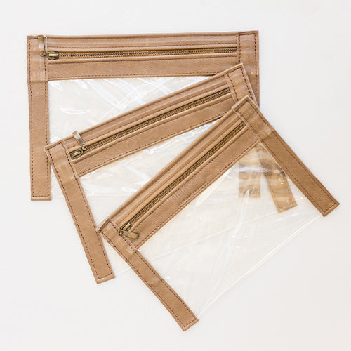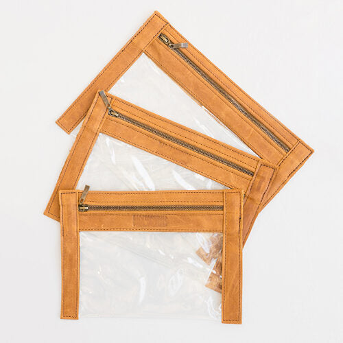 This travel set is made in three different sizes. It has a genuine leather trim finish.