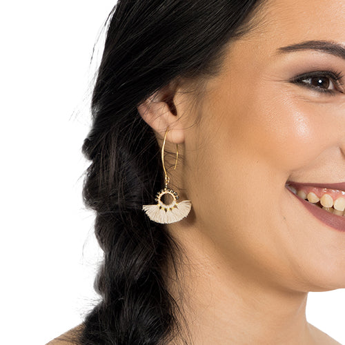Pyrite Wrapped Hoop earrings with a Mini Flare tassel on a curved Earwire.