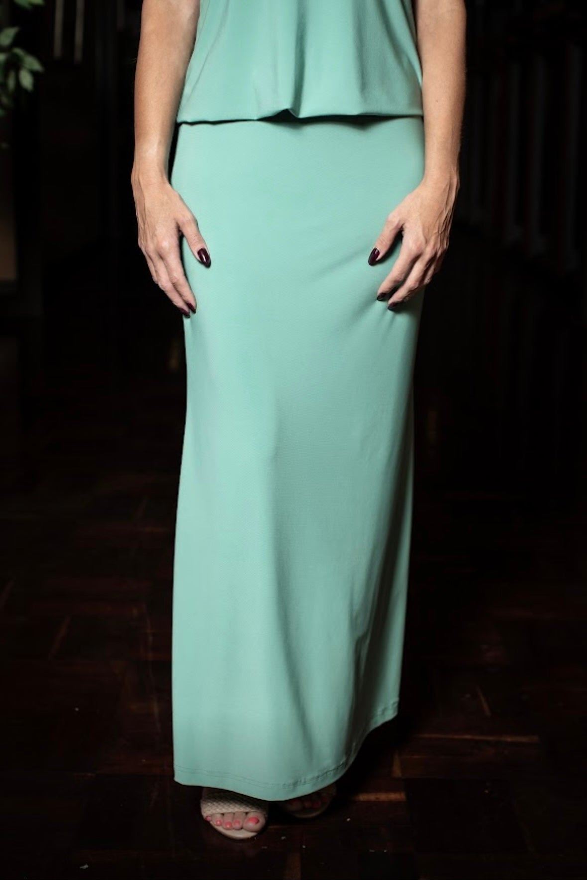 Sleek and Elegant, this dress feature a one shoulder neckline with an elastic waist that brings the fabric of the dress together. The skirt of the dress is a fitted shape and long length.
